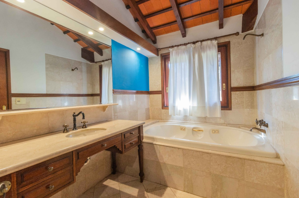 Los exteriores son igualmente atractivos: un jardín parquizado con piscina invita a disfrutar de los días soleados, mientras que el parrillero bajo pérgola ofrece el espacio perfecto para reuniones sociales. La propiedad cuenta con calefacción por losa radiante a gas y seguridad permanente.